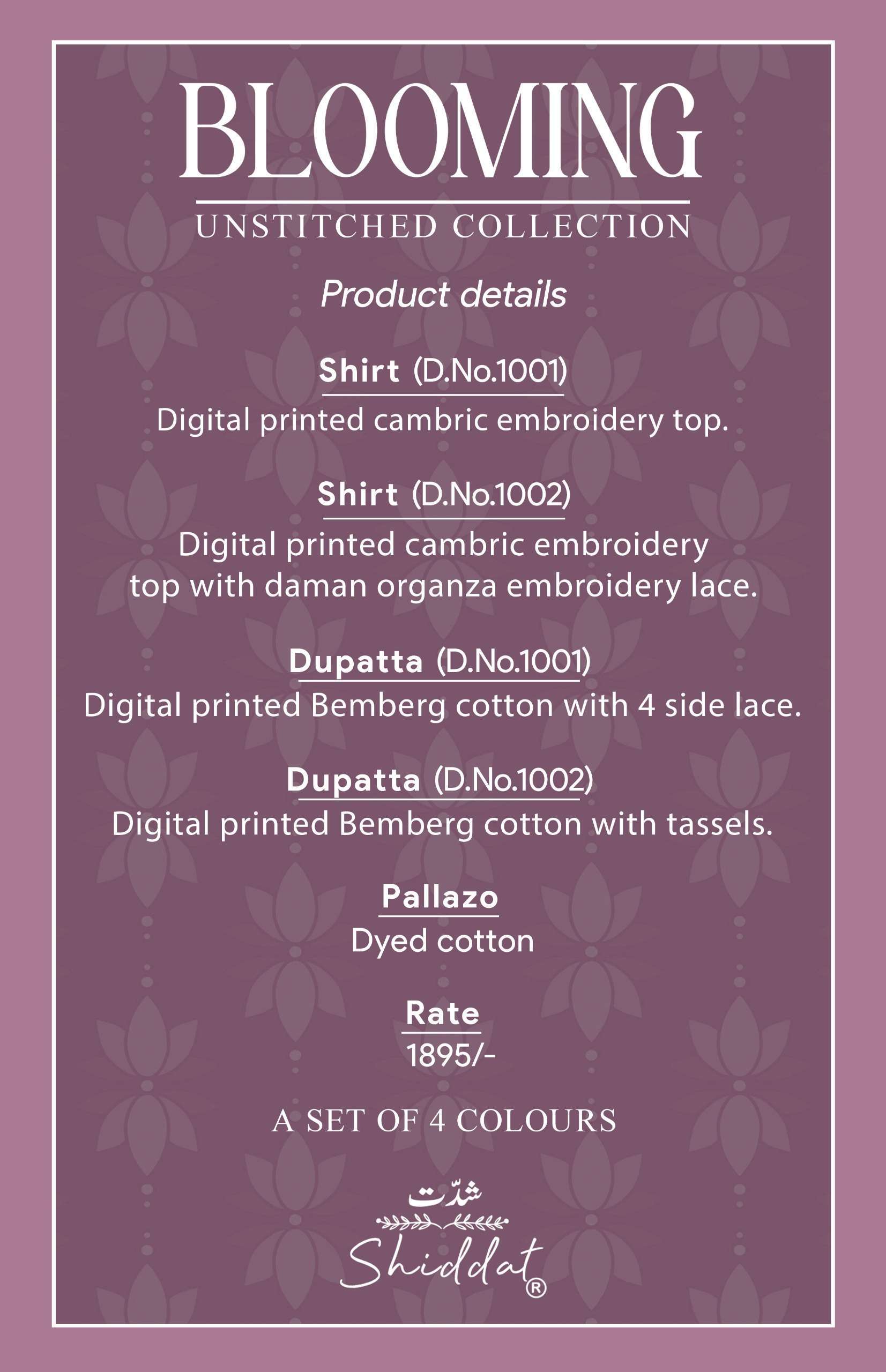 | Dupatta: | digital printed bemberg cotton with tassels. |
