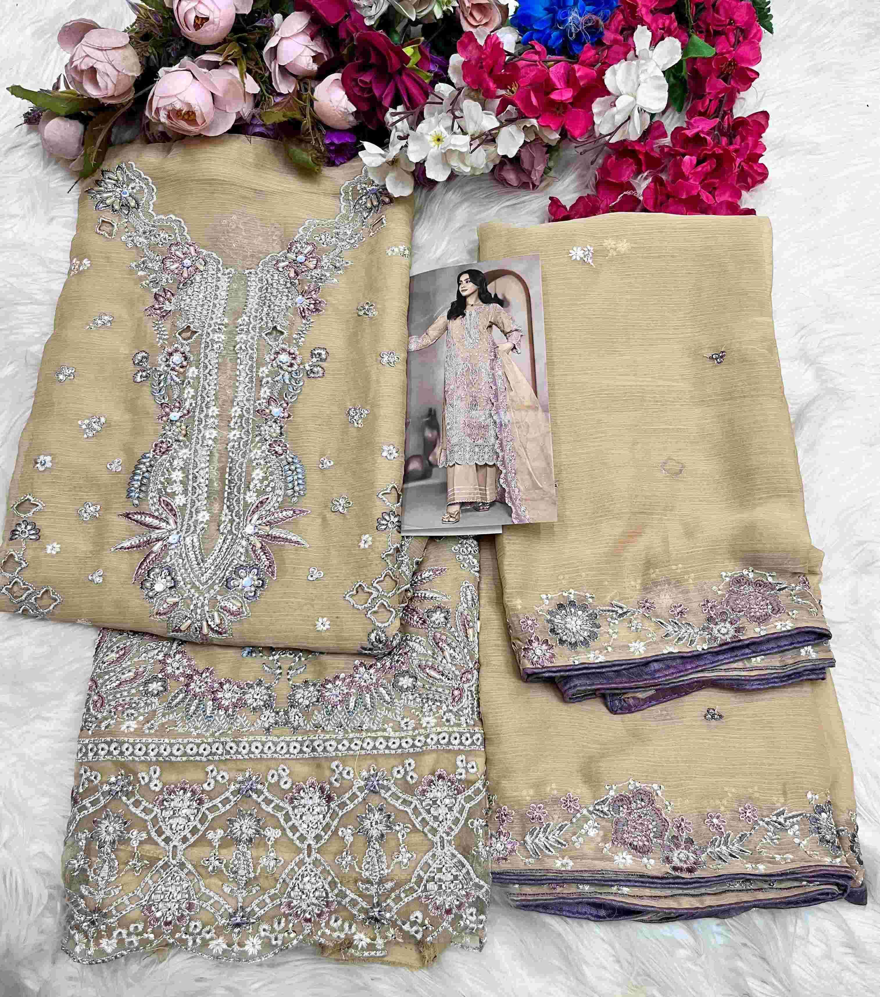 | Top: | chiffon heavy with heavy embroidery with *hand khatli & cut work |
