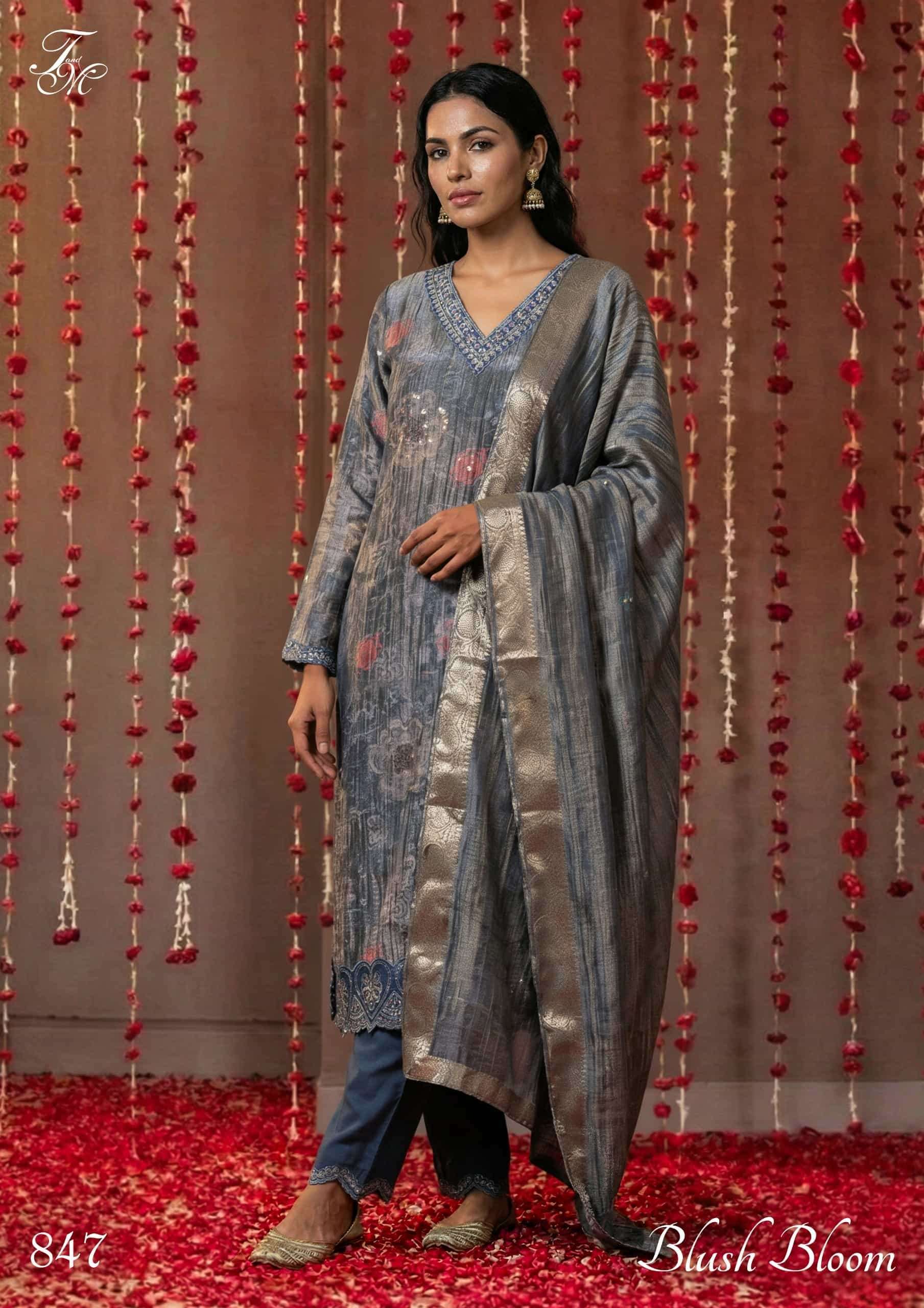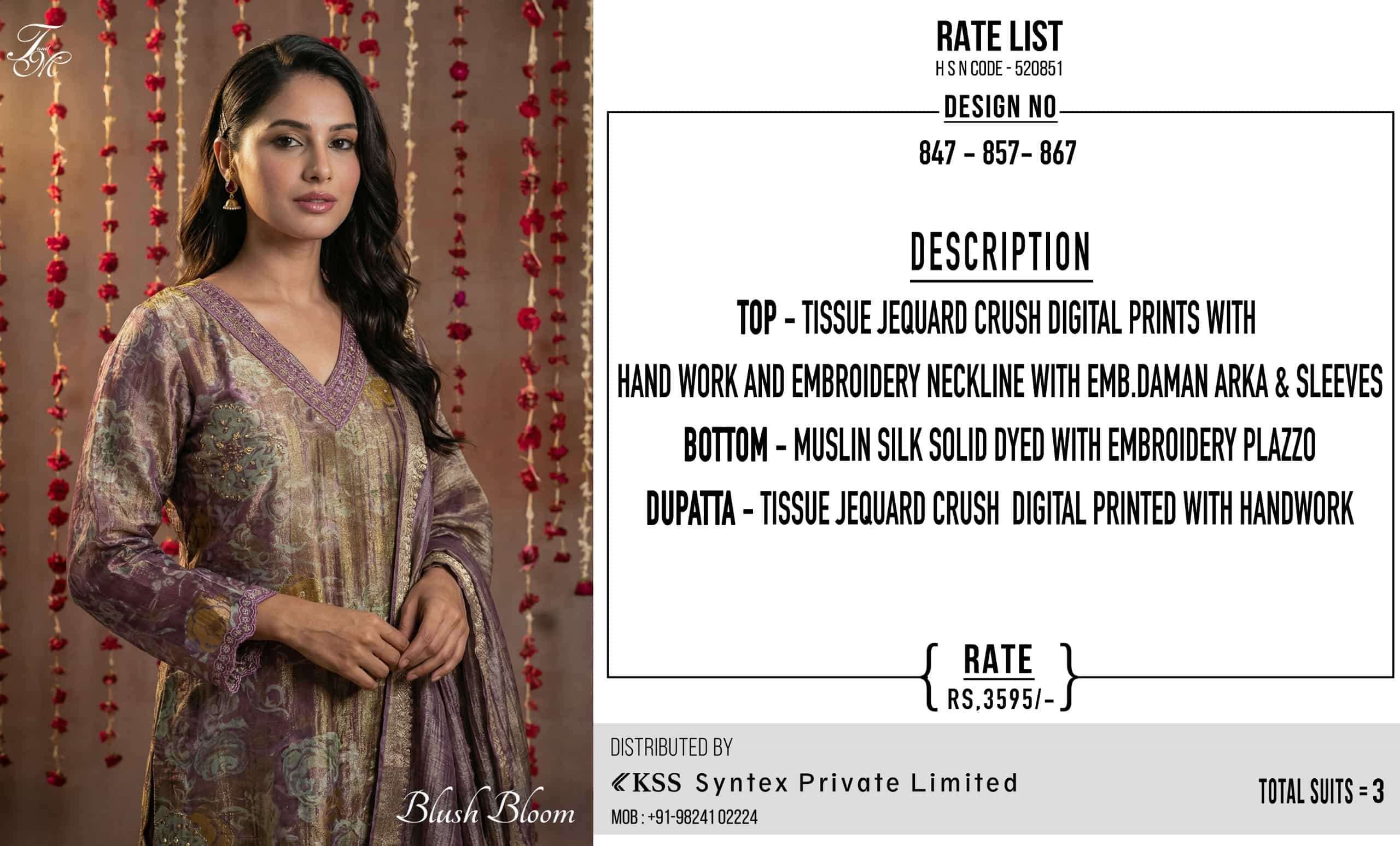 | Dupatta: | tissue jacquard crush digital printed with handwork |