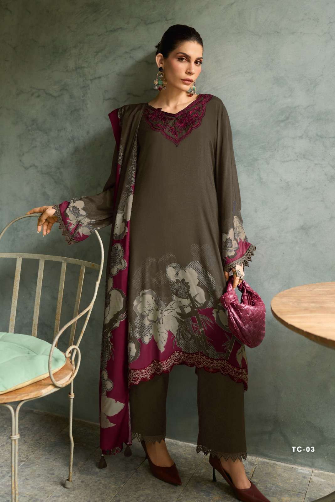 | Top: | viscose muslin digital print with embroidered neack |
