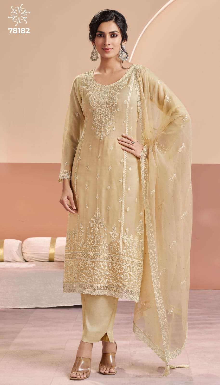 | Top: | crafted sequence and resham thread embroidery acceneted by zarkan work, the organza chiffon top and dupatta pair seamlessly with a solid santoon fabric bottom |